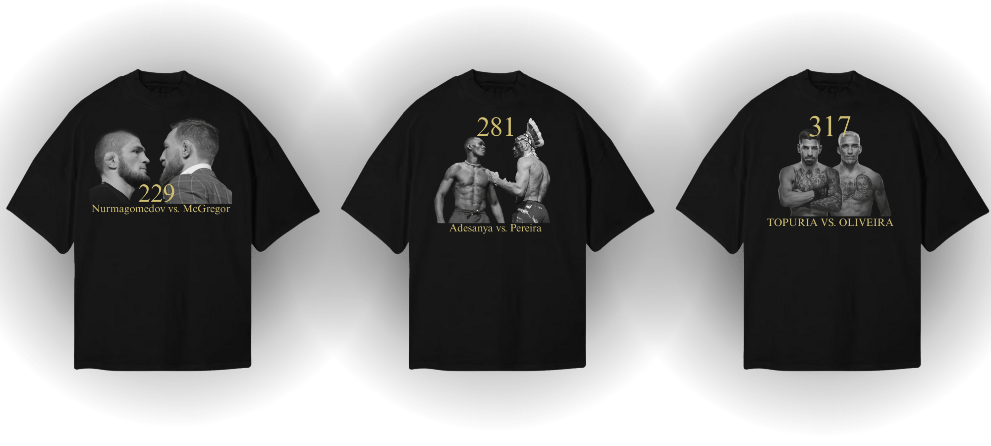 On the back of every piece of clothing is a detailed description about how the fight buildup felt and how the fight itself played out. With these pieces of history, you can forever remember how you felt on fight night.
